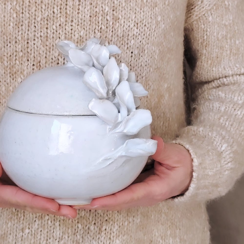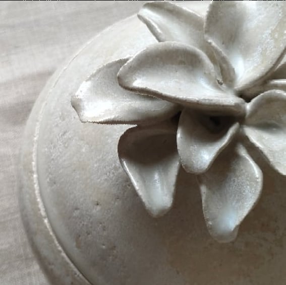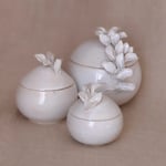 Cajas de gres en tres tamaños, realizadas en torno y con detalles vegetales modelados a mano.
