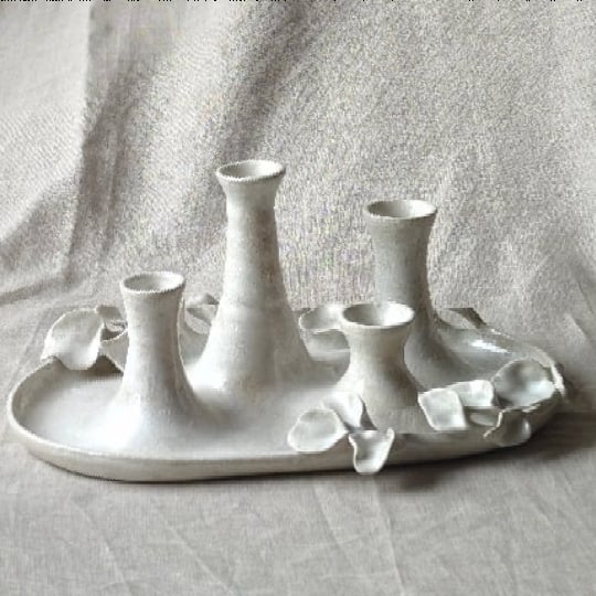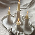 Conjunto de candelabros de gres realizado en torno de alfarero y decorado a mano con motivos vegetales.