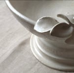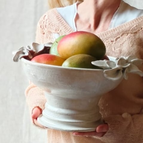 Frutero realizado en gres, en torno de alfarero y con detalles vegetales modelados a mano.